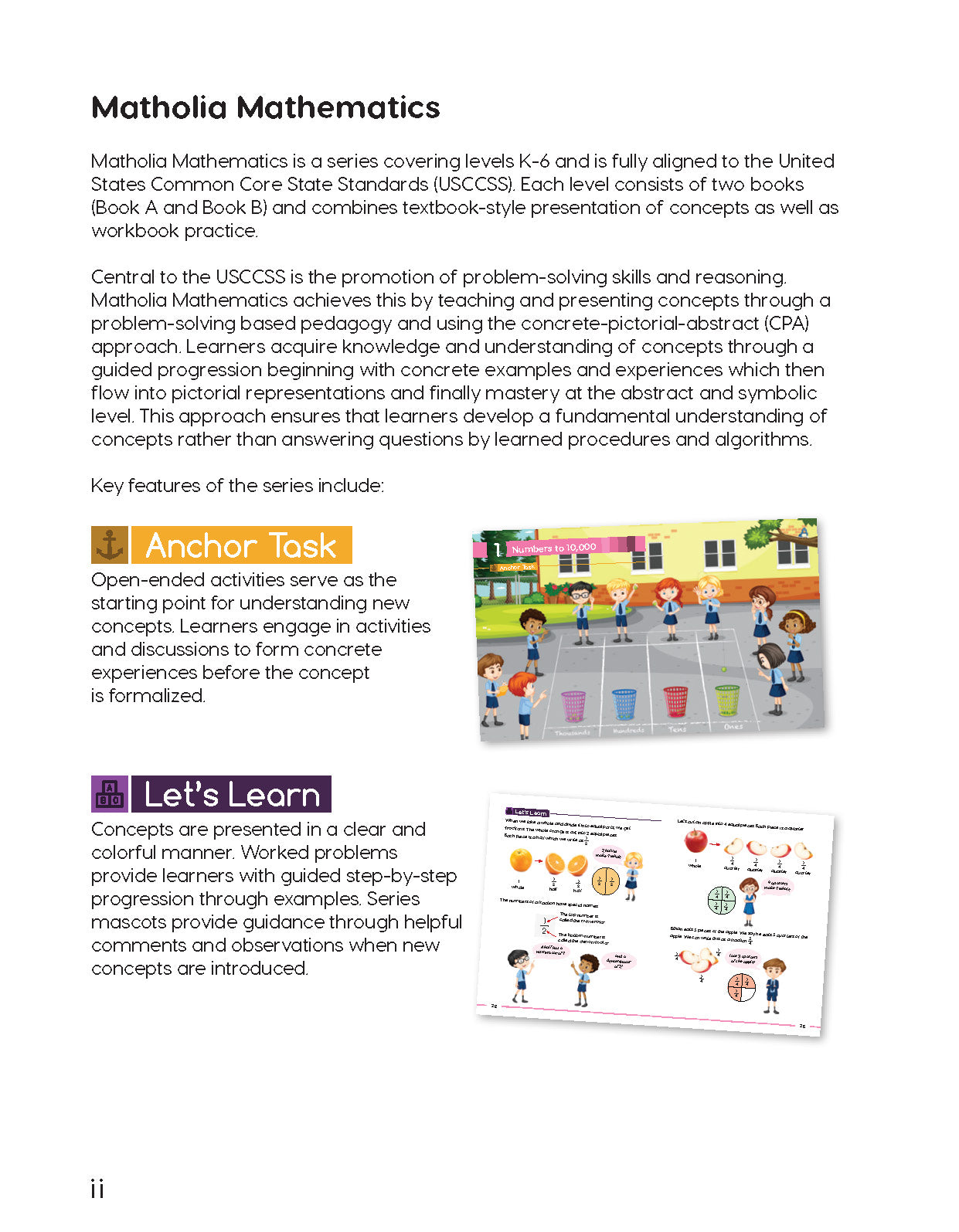Matholia Mathematics is a series covering levels K-6 and is fully aligned to the United States Common Core State Standards (USCCSS). Each level consists of two books (Book A and Book B) and combines textbook-style presentation of concepts as well as workbook practice.